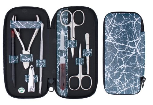 Nők és férfiak számára egyaránt ideális 8 részes manikűrkészlet cipzáras, türkíz-fehér mintás bőrtokban; DUP és solingeni eszközökkel.