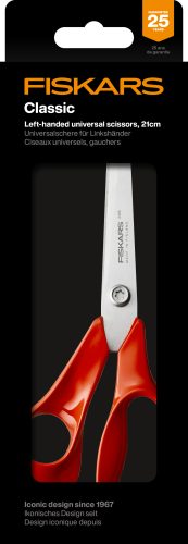 A Fiskars Classic univerzális konyhai olló, balkezesek számára tervezve, ideális választás a konyhai és háztartási feladatok széles köréhez. Ez a 21 cm-es olló (pengehossz 10,2 cm) tökéletesen alkalmas papír, karton, műanyag, fóliák és csomagolások vágására is. A Fiskars Classic olló egy igazi klasszikus, melyet a tartósság és a funkcionalitás jellemez. A termékre 25 év garancia vonatkozik!